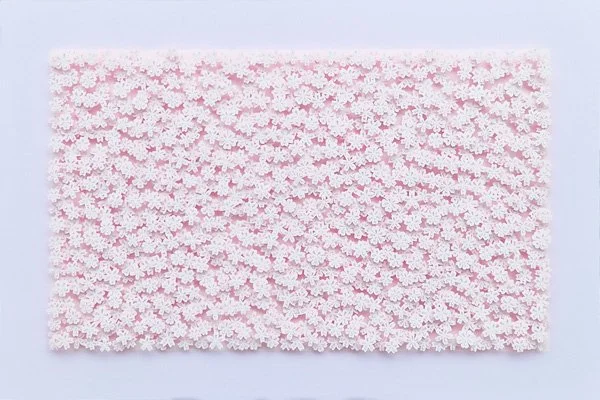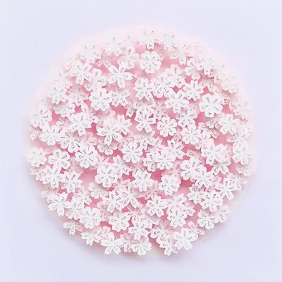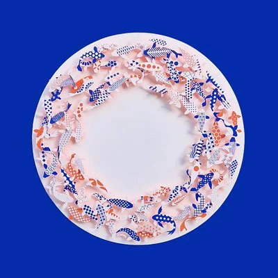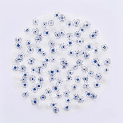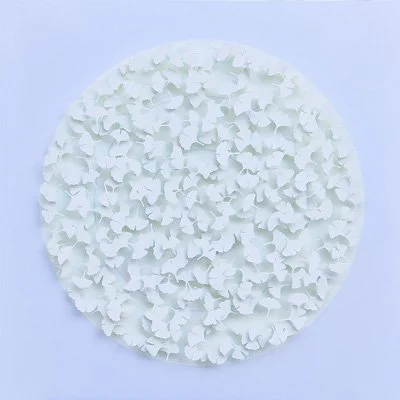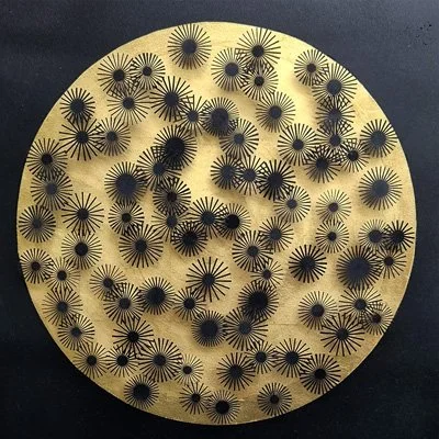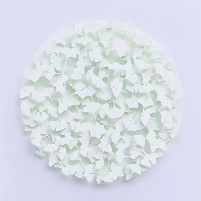 Inspired by a paper target peppered with holes left by arrows, these works are all unique in layout. The energy of the arrows is transformed into delicate patterns of leaves and flowers.